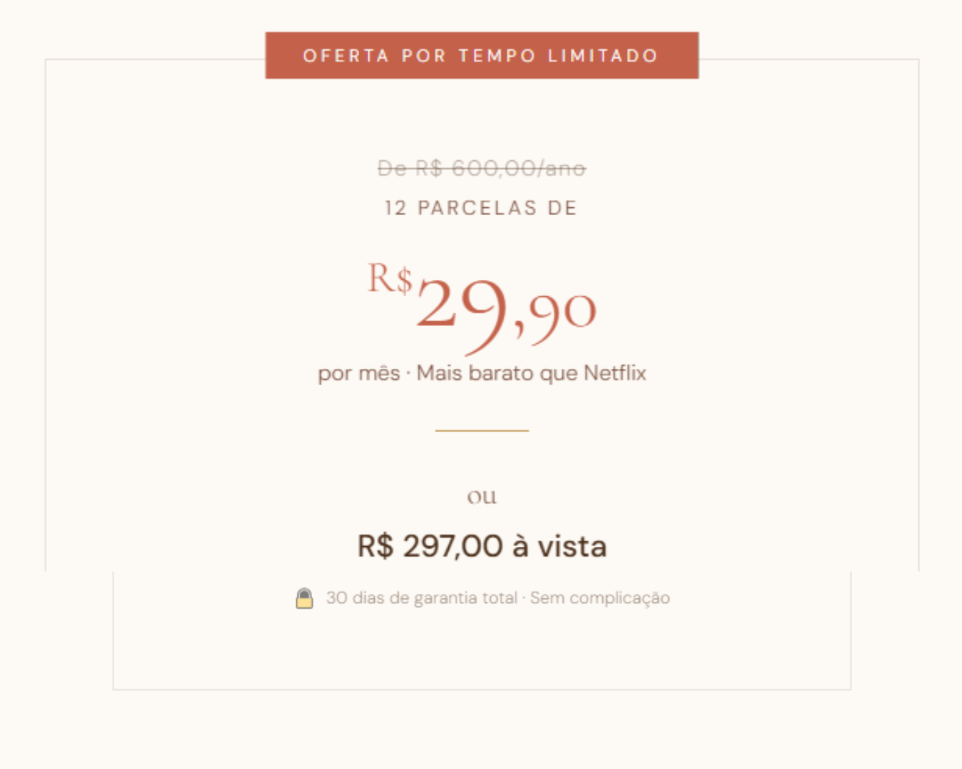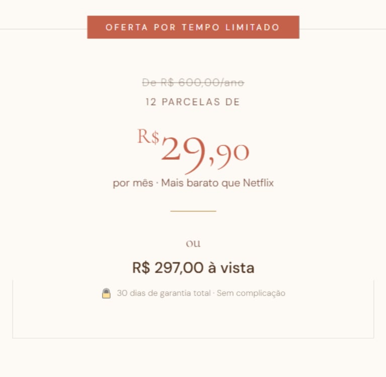 Você tem 30 dias de garantia. Entra, olha, participa. Se perceber que não é pra você, basta pedir o reembolso; sem demora, sem complicação.